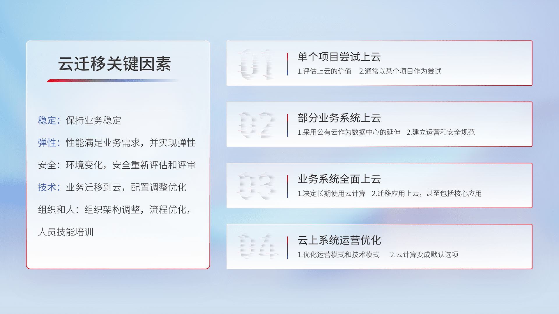 结合实际业务,,,从规划设计、、云平台选型、、、云原生改造、、、、数据迁移、、、、集成交付,,迁移全过程为客户识别最佳上云路径,,,,做好风险识别管理,,,,设计网络架构、、、身份权限、、、安全审计合规、、操作审计、、、、日志审计、、、、监控告警策略、、、、多站点容灾设计等,,对云上基础设施进行整体规划,,,,提升IT治理水平,,,以满足弹性、、、高可用、、、高性能的需求。。。