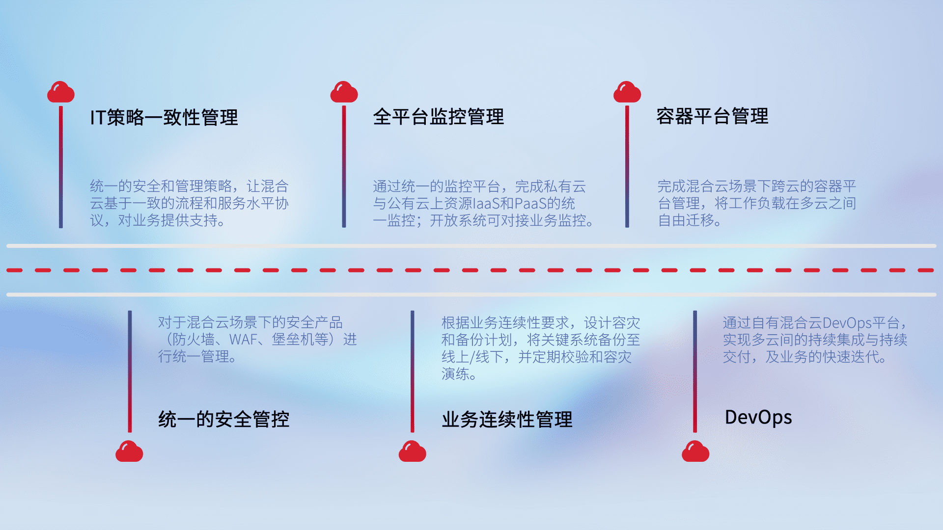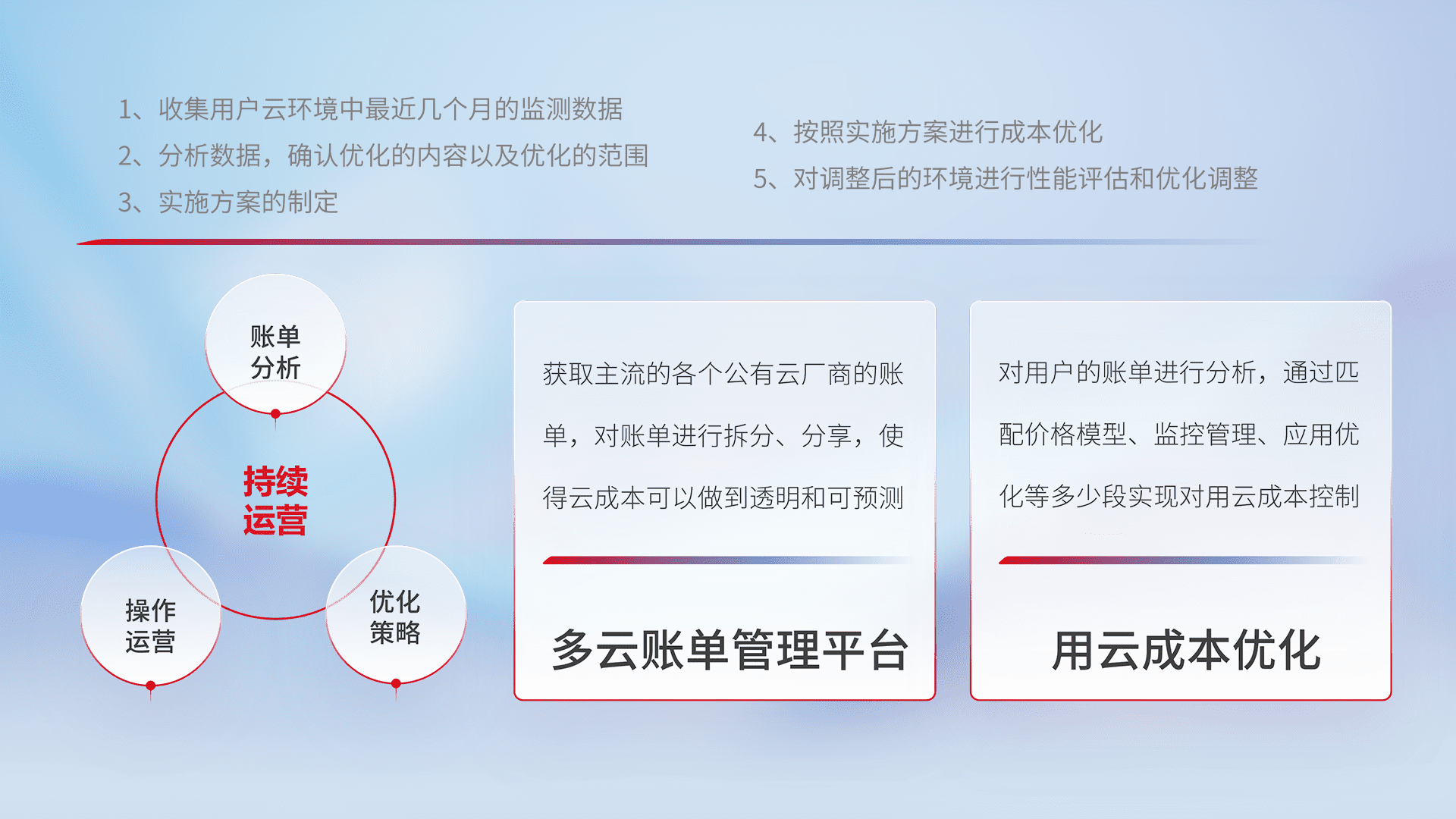 通过多云纳管,,,,以统一的资源数据模型把客户的云资源进行抽象和封装,,,,进而实现对多云资源的统一操作,,,,保障云资源管理的可靠性、、、稳定性与可用性。。。。量身定制化运维内容,,配置、、、开发运维、、、、补丁管理、、、备份、、、监控、、认证和访问管理、、、审计和日常巡检等,,,保障在用云过程中的可靠度,,,,稳定度以及高可用率。。。