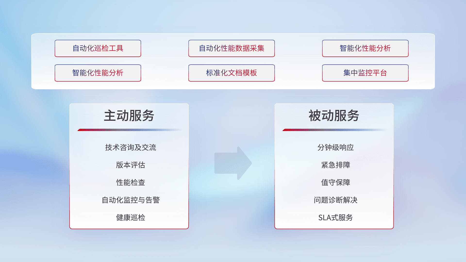 智能化工具和标准化文档,,,保障服务质量,,提供主动服务(包含技术咨询、、版本评估、、、、性能检查、、、自动化监控与告警、、、、健康巡检)和被动服务包含(分钟级响应、、、、紧急排障、、值守保障、、、、问题诊断解决、、、SLA服务)。。。
